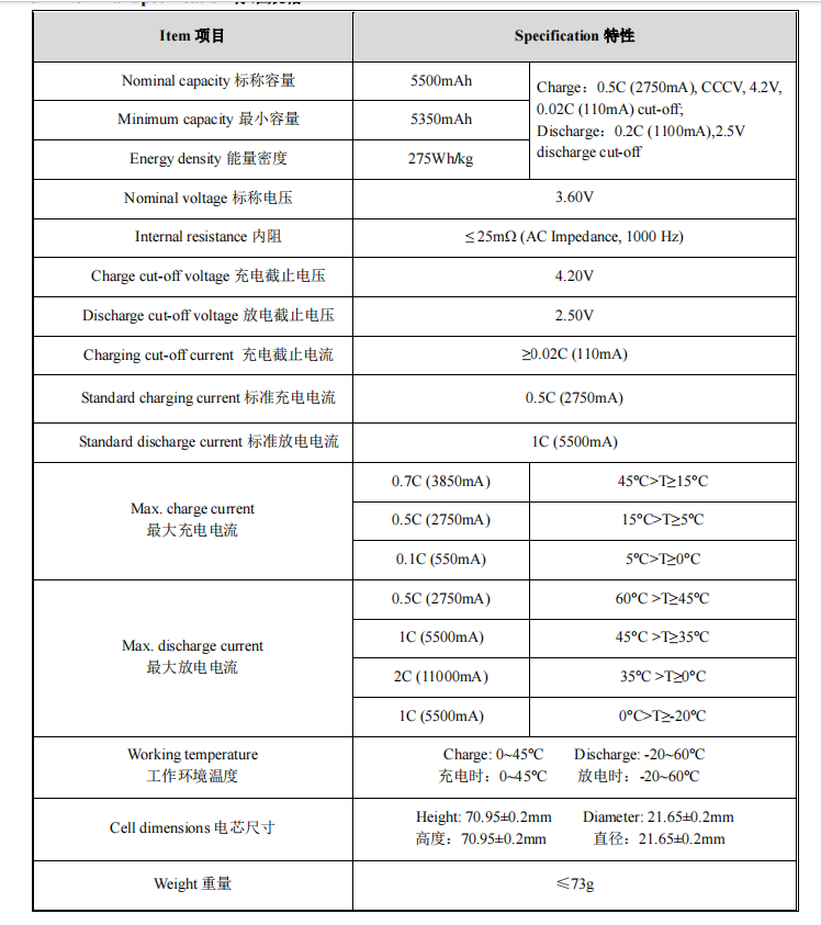 | Capacity | Std. charge / discharge | 5500mAh |