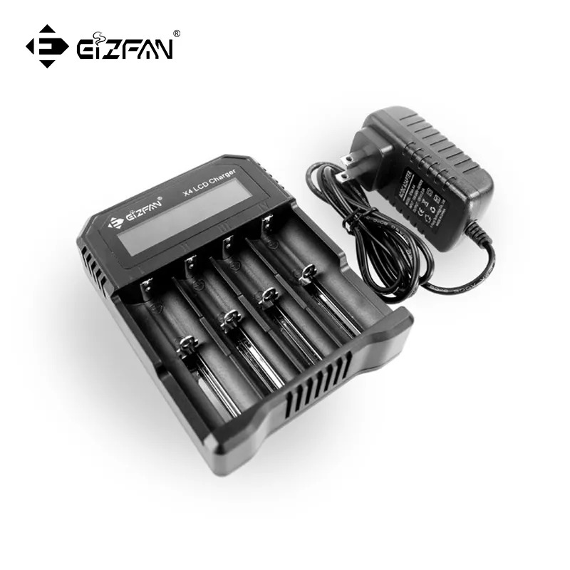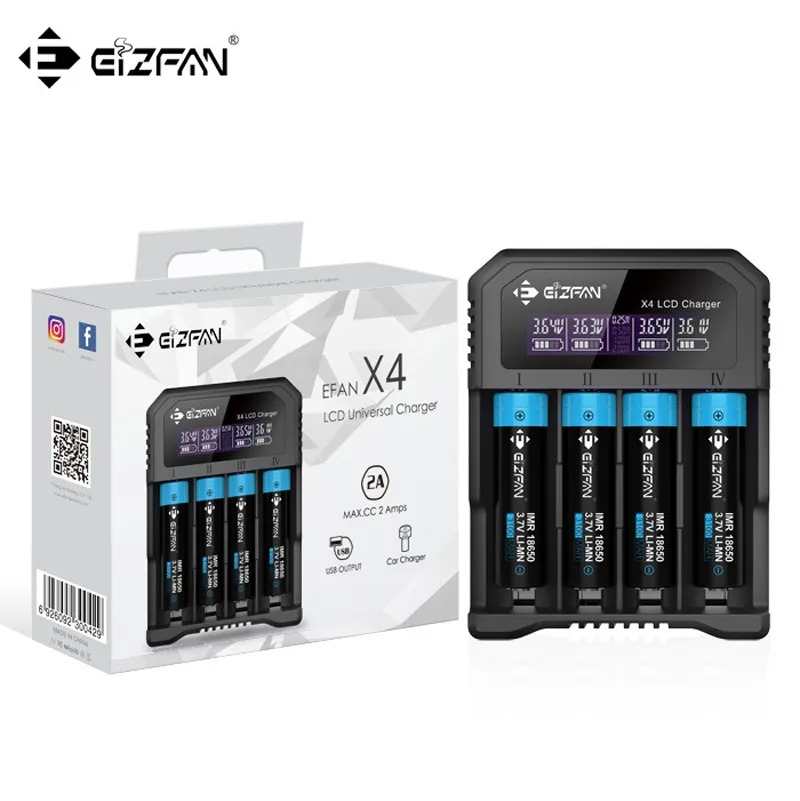 Efan X4 Intelligent Battery Charger — Universal charger with LCD display, USB output, and car charger support. Capable of charging multiple battery types with intelligent detection and optimized safety features.